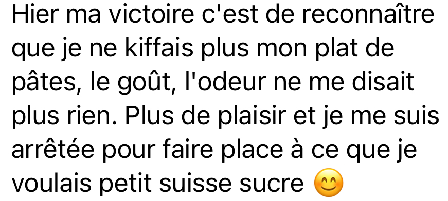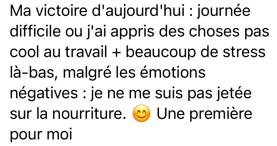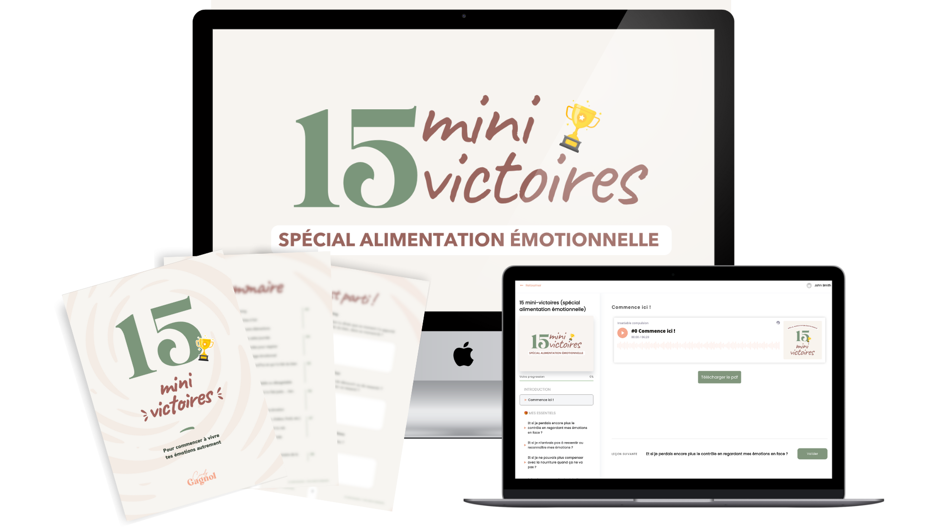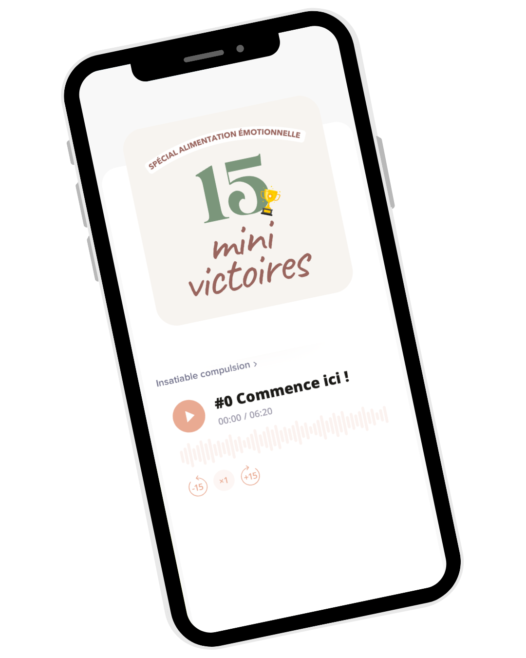 Dans ce cas, je te recommande plutôt de découvrir le programme [15 mini-victoires – spécial comportement alimentaire], pensé spécifiquement pour t’aider à réguler ton comportement alimentaire avant de t’attaquer aux émotions. Cela t’évitera d’être parasitée par les effets de la restriction ou du contrôle alimentaire, et te permettra d’avancer étape par étape, dans le bon ordre.