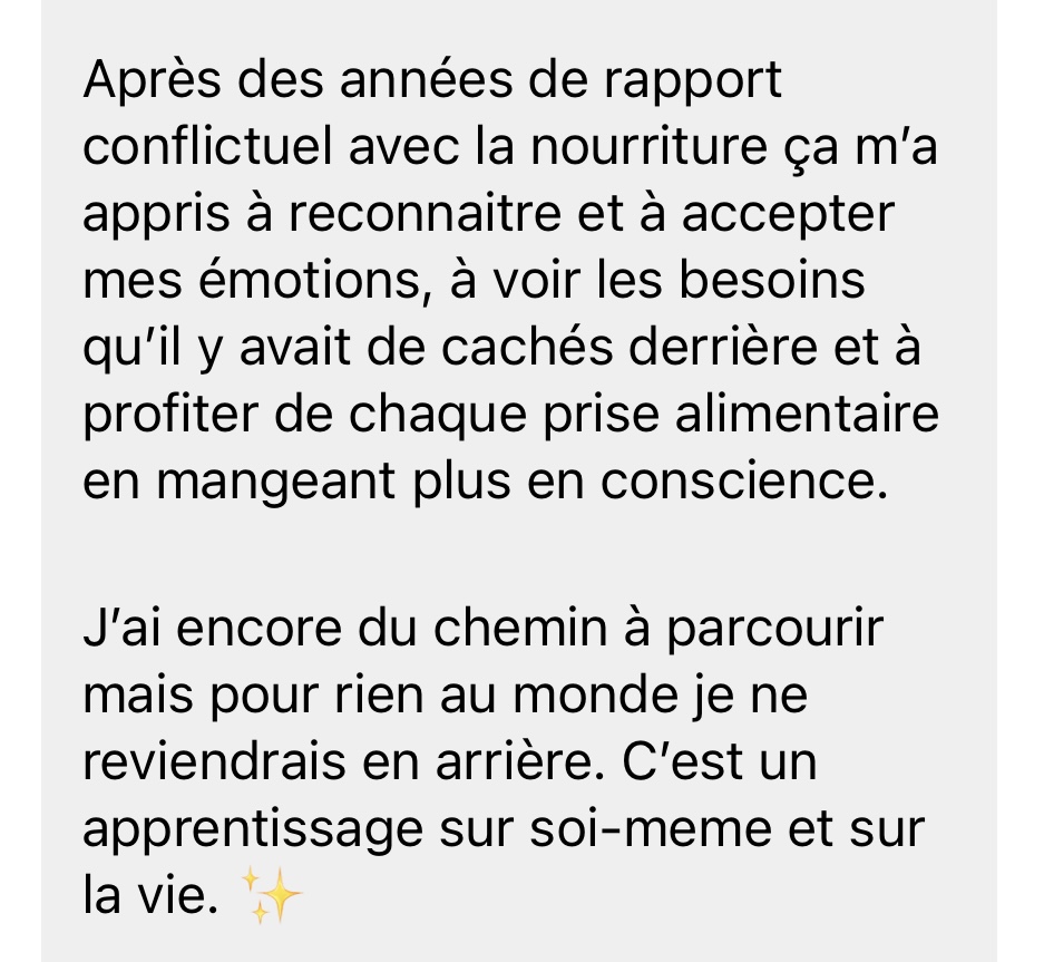 Depuis, j’ai accompagné plus de 700 femmes vers une relation plus sereine à la nourriture - sans régime, sans restriction, sans culpabilité.