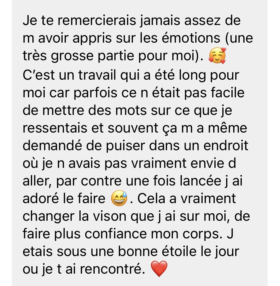 Mais c’est justement le cœur du travail qu’on fait ici : t’aider à te reconnecter progressivement à tes ressentis, à tes émotions, et à tes besoins.